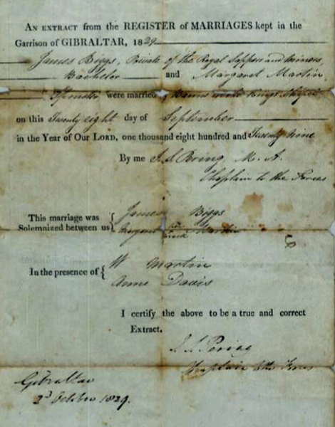 In this heightened atmosphere love blossomed, and on 28 September 1829 James Biggs and the very young Margaret Martin were married in the King's Chapel, Gibraltar. In 1830 the company was back in England, but on 23 September Biggs with twenty-two other men again sailed for Gibraltar. In 1834 cholera swept through the garrison causing 380 deaths. Biggs was one of those hospitalised, and was soon in trouble with authority again for being disorderly in his quarters and using improper and threatening language to a non-commissioned officer. On Christmas Eve 1837 Biggs left Gibraltar for the last time and began a posting in England, at Hythe and later Woolwich. The Biggs's first child, William, had been born in January 1831 and a second child, Elizabeth Jane, was born on 15 September 1833. A third child, Amelia, was born in 1838, and a son, James Samuel, was born at Woolwich on 28 May 1841.
