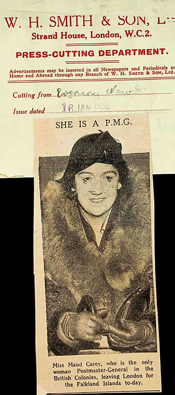 Her parents were Charles Carey, an ex-Royal Marine who became chief of police and Ellen Elizabeth, née Rudd. Maude became a pupil teacher at the Government School in Stanley on 2 March 1903 and took up employment as post office clerk on 3 August 1920, rising to first clerk under Mr G L Brown, postmaster.