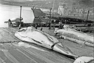 (1) Ian Hart comments that image 1725 was taken at Grytviken in the 1956/57 season when Pesca chartered a fleet of catchers from the Japanese company Kyokuyo. These vessels had been transformed in 1949-50 from war time corvettes into whaling ships by Aristotle Onassis and used with his pirate whaling fleet in the Antarctic 1950--56.