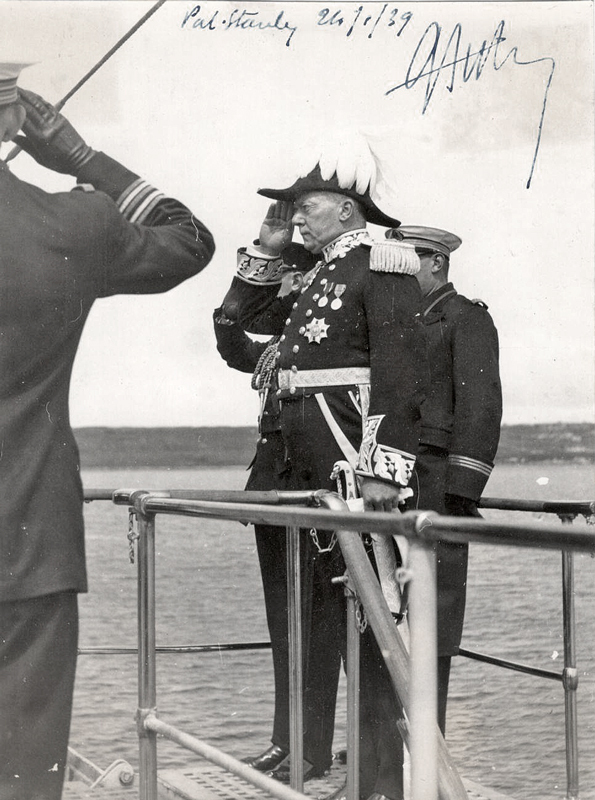 In 1939 Henniker Heaton had just tendered his resignation to the Colonial Office, effective from his 60th birthday in February 1940, when World War II broke out. He immediately withdrew his resignation for the duration of hostilities and became occupied with the task of establishing the Islands on a war footing. The FIDF were called out and coast-watching units set up at strategic points. After the Battle of the River Plate in December 1939, the resources of Stanley were fully stretched when HMS Exeter, Ajax, Achilles and Cumberland returned to the Islands and the wounded were brought to the King Edward VII Memorial Hospital. Exeter was so badly damaged that even her able-bodied ship's company had to be billeted ashore while the ship underwent repair. When Exeter left the Islands a month later, Captain BELL wrote to assure the governor 'that the officers and men of 'EXETER' will long cherish their thoughts of the Falkland Islands and all the memories that go with them'.