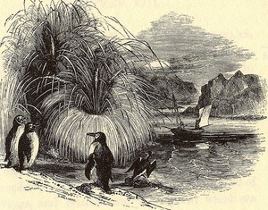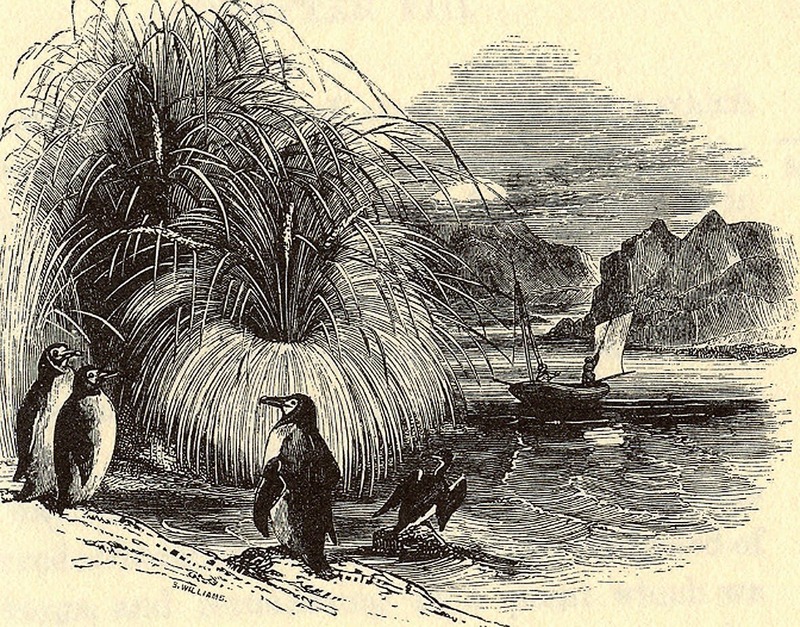 The sands and peaty soils of the Falklands are colonised by many grass species. Tussock grass, (Poa flabellate), excited the attention of Governor Moody when he perceived its potential not only as fodder but also as an agricultural crop on the poor soils on the west coast of Ireland and on the Hebrides. He offered for renting or purchase 300 acre plots on small islands covered with this grass. He grew it himself in an experimental garden and infected Hooker with his enthusiasm. It was, Joseph Hooker told his father, 'the gold and glory of the Falklands and will yet I hope make the future of Orkney and the owners of the Irish peat-bogs.' The wild cattle and horses liked it so much, he told his sister, that they would eat dry tussock thatch from the roofs of houses in preference to other grasses. Vast tracts of the Falklands were covered with its gigantic hemispherical hillocks up to five or six feet high. Each clump supported about 200-300 blades of grass and the spaces between each community of clumps Hooker likened to a 'labyrinth'. Pernety and Gaudichaud had inevitably called attention to it, but Hooker was the first to describe it with botanical precision. It featured prominently in the report that Moody prepared for the Colonial Office recommending that it should be brought to the attention of botanists in the Linnean Society of London.