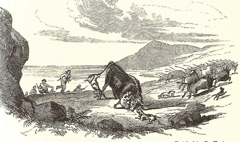 ...the dogs soon caught one cow by the nose and tongue whilst a third held him [sic] by the tail till a man came, hammering him and with two strokes of the knife plunged it into its throat, kicked the dogs off who commenced licking the blood and gave chase to the rest of the herd.