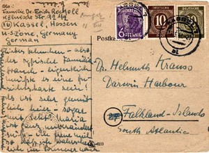 In September 1946 Krauss’s wife Maria was in the British Zone in Germany and had become unwell. He requested permission to send food parcels to her. This request was denied as it was contrary to the current regulations. While Krauss was at Darwin he received a postcard (see image 1969) from a number of his friends and relatives: