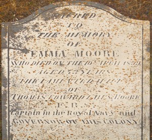 Governor Moore was the first governor to reside at Government House, begun in 1844 but still in the process of being built; the wooden cottage previously used now became the Government Office. The Births Register records that the Moores had a second daughter, Lydia Edith, born in the Islands on 8 February 1856. But on a less happy note, the Deaths Register shows that Emma Jane Moore died on 10 April 1859 aged 43 from angina pectoris. She has the sad distinction of being the only Governor's wife to be buried in Stanley cemetery. Moore wrote home that she had a short but painful illness. Clearing up her papers in January 1860, Moore was shocked to find affectionate letters from the magistrate Thomas BROOKE. The magistrate was taxed by Moore with this betrayal and - while he was home on leave in 1860 - by the Colonial Office. Brooke wrote a long letter, excusing himself, not denying the offence, but painting a picture of a boorish, suspicious and dishonourable governor.