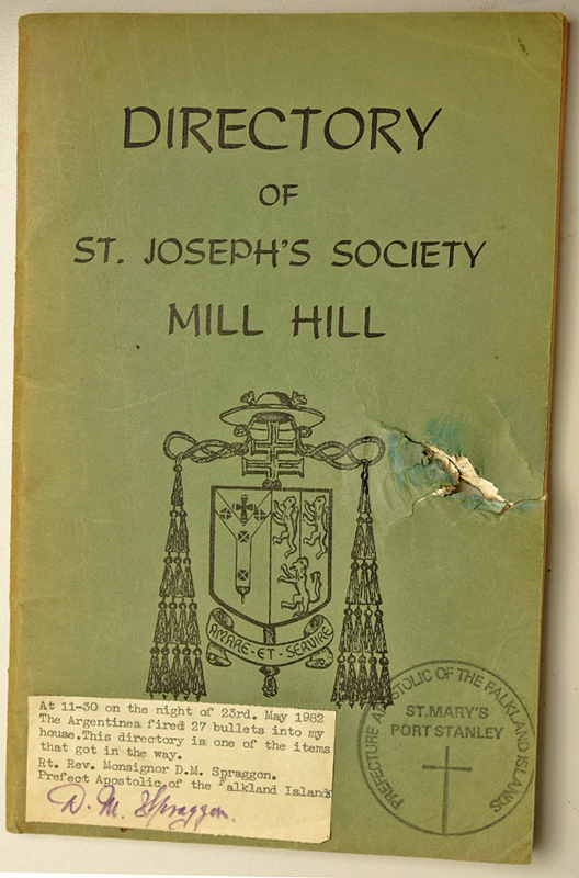 I served in the conflict of 1982 with the Commandos and on the surrender was housed on the hall adjacent to the church. We were well looked after by the Mothers Union who made us bread each day. My mother was a devout RC and a member of the Mothers Union in Birmingham (St Gerard's). She attended church each day I was away. She wrote a letter to Monsignor Spraggon on my return. I met and spoke with Monsignor whilst in the hall and he took us into his house showing the bullet holes in the walls and also the book that you mention. I believe one of the books was a bible and the bullet remained in bible. He was a great person.